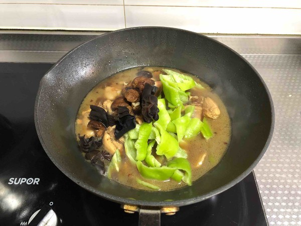 8.加入青椒,木耳和香菇,調(diào)入食鹽炒勻,再燉10分鐘