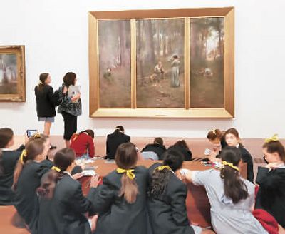 在墨爾本當(dāng)?shù)氐拿佬g(shù)館,孩子們圍坐在一起,聽老師講解畫作。