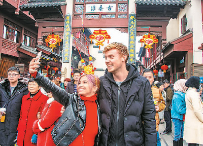 外國(guó)游客在南京夫子廟游玩時(shí)自拍留影。谷昌旺攝