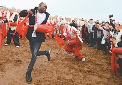 在陜西延安安塞區(qū)南溝進(jìn)行的一場(chǎng)腰鼓演出結(jié)束后,一名外國(guó)游客與當(dāng)?shù)匮氖止餐蚱鹆搜摹P氯A社記者 劉 瀟攝