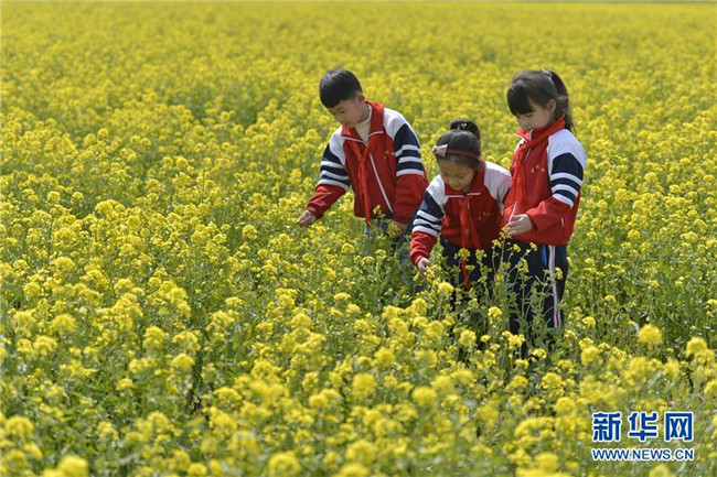 3月26日,幾名小學生在河北省沙河市東葛泉村油菜花田內玩耍。