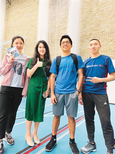 在南安普頓大學(xué)主校區(qū)的體育館,王子君(左二)剛參加完乒乓球比賽。