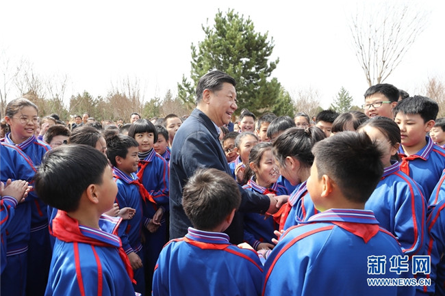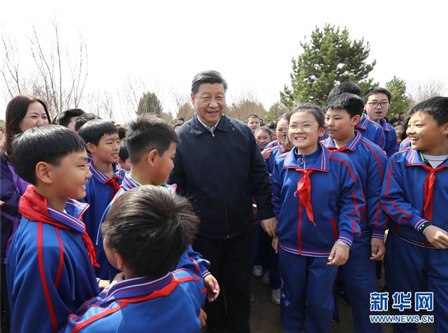 4月8日,黨和國家領(lǐng)導(dǎo)人習近平、栗戰(zhàn)書、汪洋、王滬寧、趙樂際、韓正、王岐山等來到北京市通州區(qū)永順鎮(zhèn)參加首都義務(wù)植樹活動。這是習近平同少先隊員在一起。 新華社記者 鞠鵬 攝