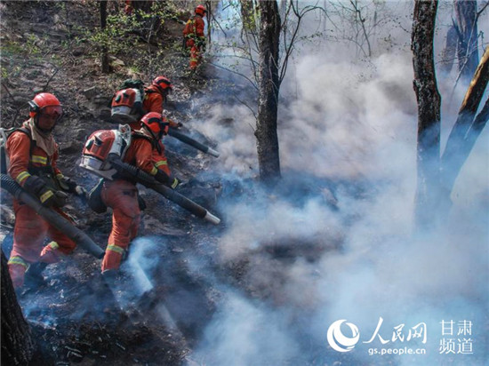 消防員到達(dá)火場(chǎng)后開(kāi)始打火。(甘肅省森林消防總隊(duì)供圖)