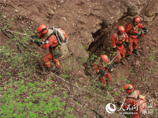 消防指戰(zhàn)員現(xiàn)場(chǎng)開(kāi)辟臨時(shí)通道,采用繩索攀登的方式組織上山。(甘肅省森林消防總隊(duì)供圖)