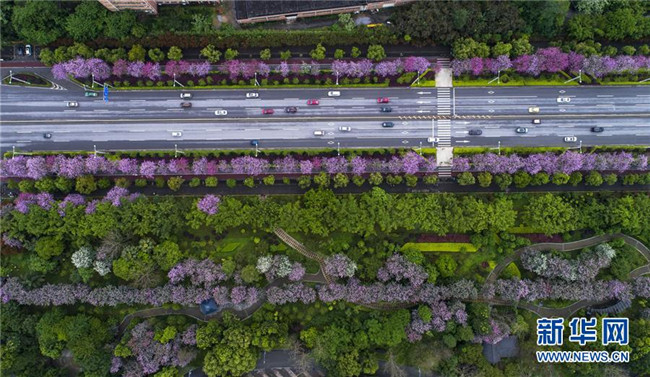 4月14日,在廣西柳州市學(xué)院路,車(chē)輛在開(kāi)滿(mǎn)洋紫荊的街道上行駛(無(wú)人機(jī)拍攝)。
