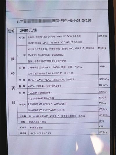 海淀區(qū)某中學則向家長公開了收費明細。在家長王先生提供的游學清單上,記者看到5天的研學旅行費用為3980元,游覽地點包括南京大屠殺遇難同胞紀念館、西湖和魯迅紀念館等。行程中還設置了眾多教育內容,比如參加南京大學講座、著漢服行謝師禮、探究杭州西湖的光學現象等。