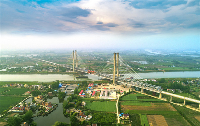 商合杭鐵路重點(diǎn)控制性工程裕溪河特大橋,主橋全長686米,主塔采用“H”型索塔,塔高123米。在我國時(shí)速350公里高速鐵路大跨度斜拉橋建設(shè)中,首次使用鋼箱桁梁結(jié)構(gòu)形式,首次在300米以上跨度橋梁中采用無砟軌道結(jié)構(gòu)形式,大橋主跨跨度達(dá)324米,建成后將成為目前世界最大跨度的無砟軌道高速鐵路橋梁。
