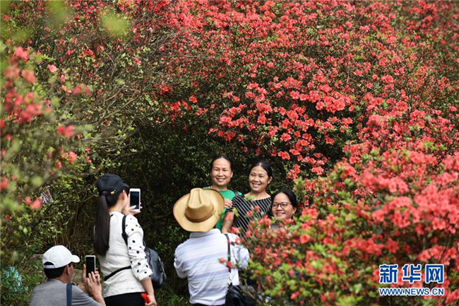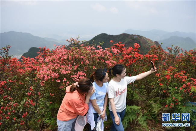 4月25日,游客在貴州省丹寨縣龍泉山景區(qū)觀賞映山紅(手機(jī)拍攝)。暮春時(shí)節(jié),位于貴州省黔東南苗族侗族自治州丹寨縣龍泉山景區(qū)的映山紅陸續(xù)開放,紅遍山嶺,吸引眾多游客前來(lái)賞花觀光。 新華社記者 楊文斌 攝