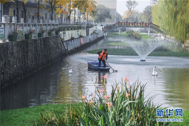 浙江省長(zhǎng)興縣虹星橋鎮(zhèn)港口村東港內(nèi),河長(zhǎng)孫根法在打撈水面漂浮物(2018年11月28日攝)。 新華社記者 徐昱 攝