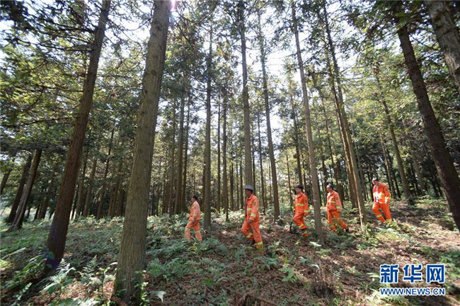 4月27日,在貴州省畢節(jié)市赫章縣平山國有林場,李瓊江(右一)、李健(右三)和林場職工在護(hù)林途中。 新華社記者 楊楹 攝