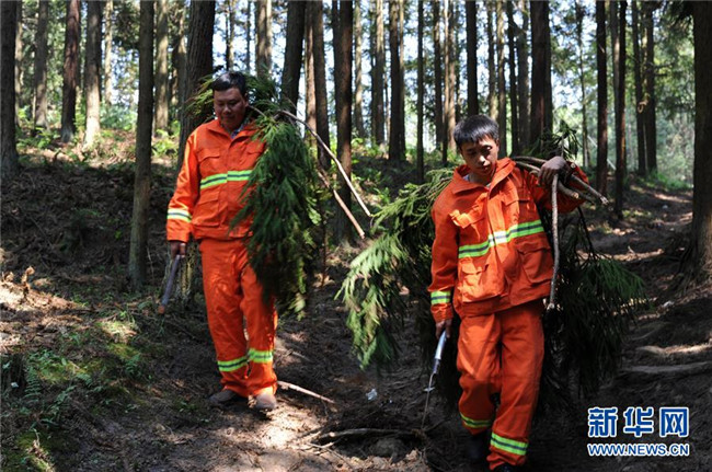 4月27日,在貴州省畢節(jié)市赫章縣平山國有林場,李瓊江(左)和李健搬運(yùn)清除的雜灌木。 新華社記者 楊楹 攝