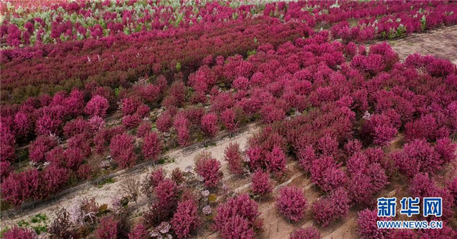 呼圖壁縣二十里店鎮(zhèn)北美海棠園內(nèi)的海棠花競(jìng)相開放(4月28日無人機(jī)拍攝)。
