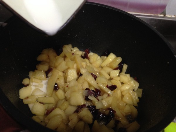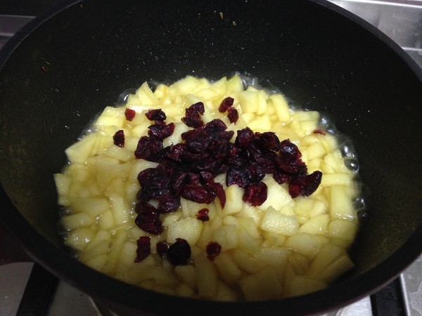 5.煮至蘋果軟蔫半透明時倒入蔓越莓干拌勻