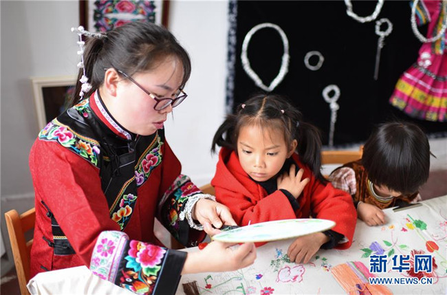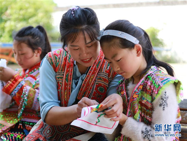 5月14日,在畢節(jié)市黔西縣協(xié)和鎮(zhèn)立新村立新小學,孩子在老師的指導下練習刺繡。新華社發(fā)(周訓超 攝)