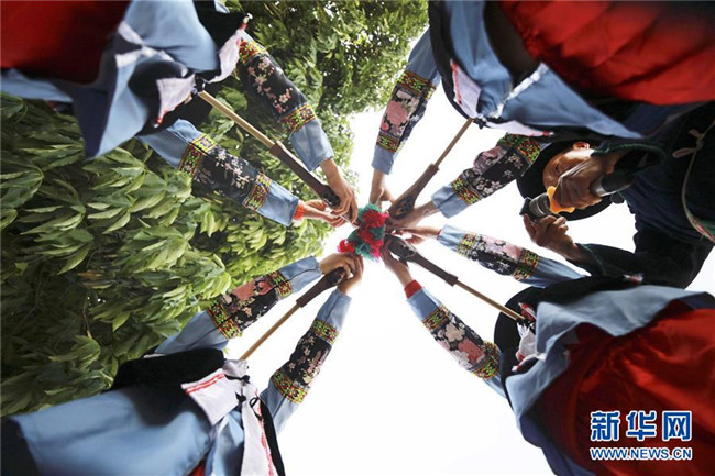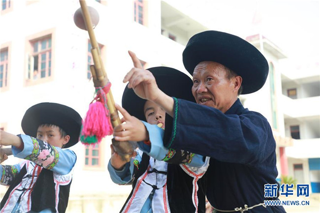 5月14日,在畢節(jié)市黔西縣協(xié)和鎮(zhèn)立新村立新小學,孩子們在老師的指導下學習蘆笙。新華社發(fā)(周訓超 攝)
