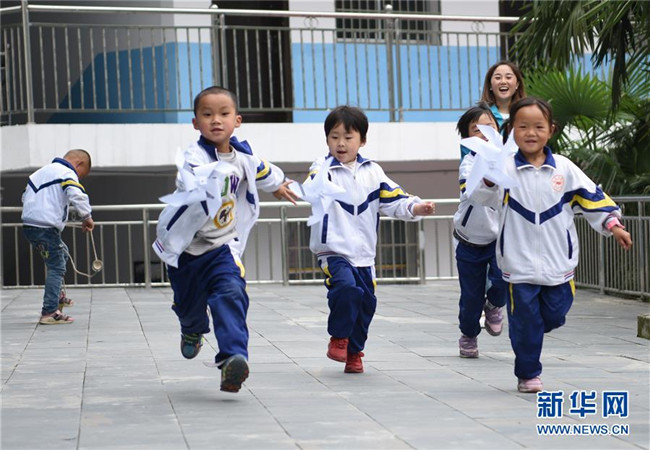 5月14日,在銅仁市松桃苗族自治縣盤石鎮(zhèn)響水洞村的山村幼兒園,孩子們在玩自己制作的紙風車。新華社發(fā)(龍元彬 攝)