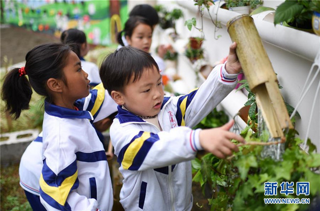 5月14日,在銅仁市松桃苗族自治縣盤石鎮(zhèn)響水洞村的山村幼兒園,孩子們在為栽培的植物澆水。新華社發(fā)(龍元彬 攝)