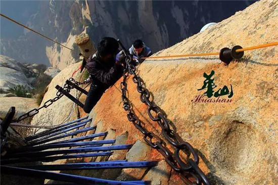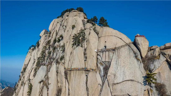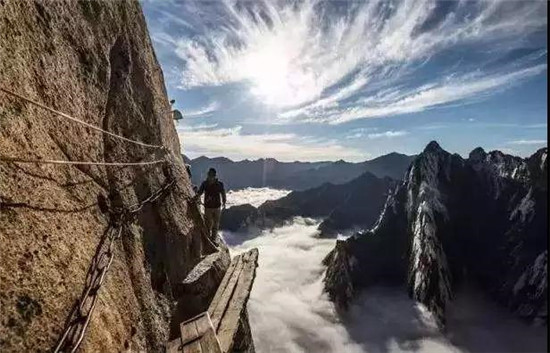 華山長空棧道位于華山南峰東側山腰。相傳,是華山派第一代宗師元代高道賀志真為遠離塵世靜修成仙,在萬仞絕壁上鑲嵌石釘搭木椽而筑。棧道上下皆是懸崖絕壁,鐵索橫懸,由條石搭成尺許路面,下由石柱固定,游人至此,面壁貼腹屏氣挪歩,是“全球十大恐怖的懸崖步道”之一。