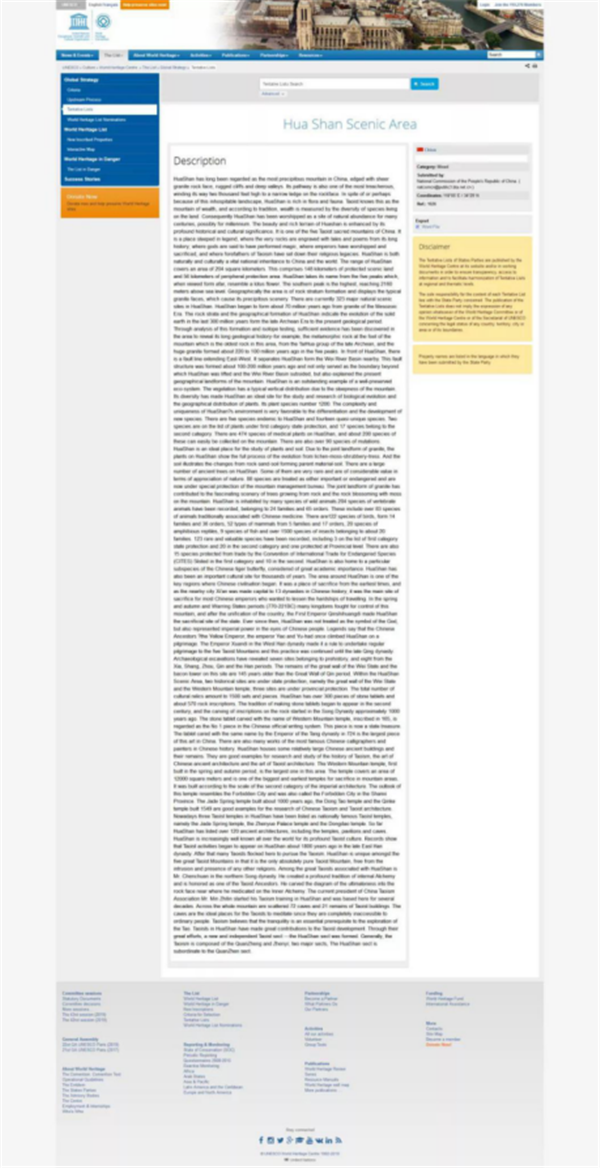聯(lián)合國(guó)教科文組織官網(wǎng)華山篇網(wǎng)頁(yè)截圖
