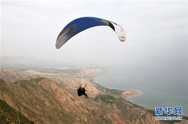 在永靖縣境內(nèi)的黃河三峽,游客體驗高空滑翔傘(5月19日攝)。 坐落于甘肅省永靖縣境內(nèi)的黃河三峽,由炳靈峽、劉家峽、鹽鍋峽組成,屬黃河上游。黃河三峽兩岸人文景觀豐富,自然風(fēng)光秀美。 新華社記者 范培珅 攝