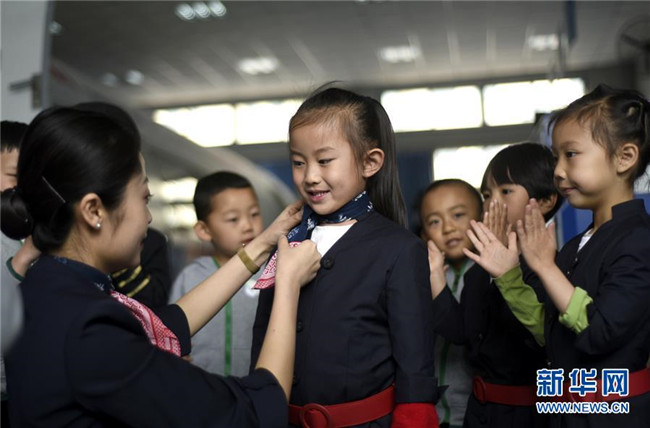 當(dāng)日,蘭州惠智博仁幼兒園的小朋友在東航甘肅分公司空乘人員的陪伴下來到蘭州文理學(xué)院,體驗(yàn)客艙安全檢查、服務(wù)禮儀示范等內(nèi)容,迎接即將到來的“六一”兒童節(jié)。新華社記者 王朋 攝