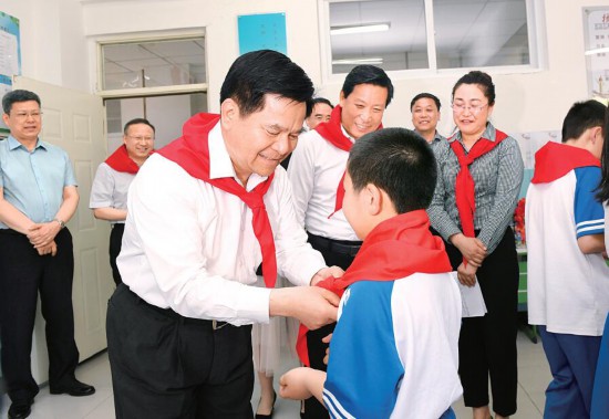 李紀(jì)恒來到一年級二班,“愛祖國、擔(dān)大任,爭做新時代好隊員”主題隊日活動正在舉行,一名少先隊員走上前來,為他戴上鮮艷的紅領(lǐng)巾。李紀(jì)恒說,看到小朋友們快樂活潑、朝氣蓬勃,我很高興,“六一”國際兒童節(jié)快到了,我提前祝大家和全區(qū)的小朋友們節(jié)日快樂、學(xué)習(xí)進步、健康成長。