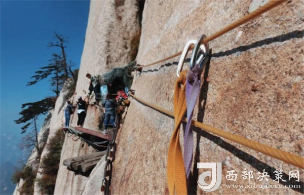長空棧道位于華山南峰東側(cè)山腰,是華山派第一代宗師,元朝初年的賀志真為遠(yuǎn)離塵世靜修成仙搭建而成。這段百余米懸空的棧道是在萬仞絕壁上鑿出來幾個(gè)踏腳之處,又在之上鑲嵌石釘搭木椽而筑,距今已經(jīng)有700多年的歷史,后人爬行至此都驚恐萬分。