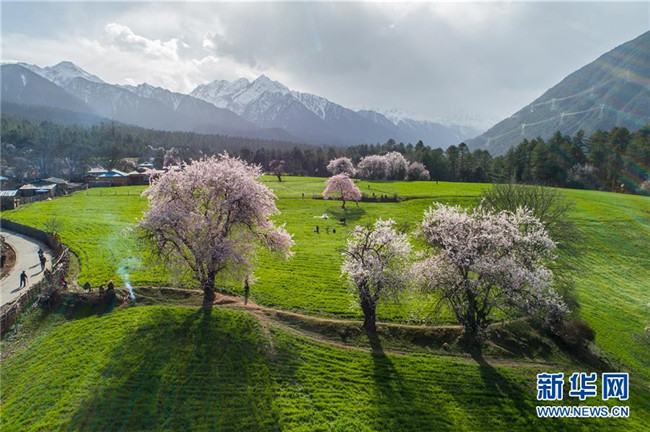 西藏林芝波密縣境內桃花盛開的田園風光(4月5日無人機拍攝)。新華社記者 李鑫 攝