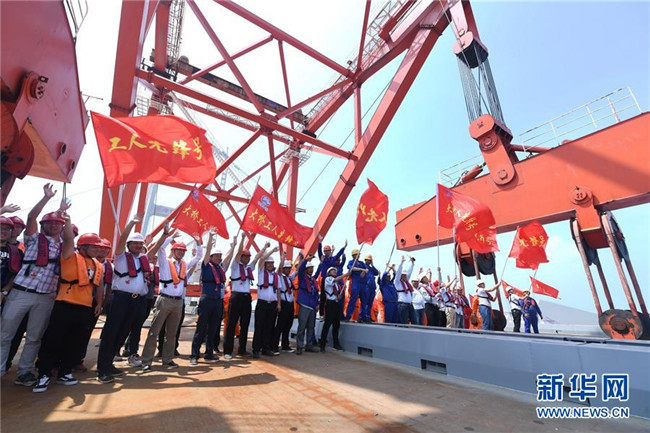 6月5日,福平鐵路平潭海峽公鐵兩用大橋的工作人員慶祝元洪航道橋主橋成功合龍。新華社記者 林善傳 攝