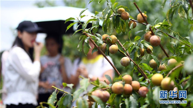 6月11日,游客在欽南區(qū)那麗鎮(zhèn)殿艮村的“扶貧李園”品嘗三華李。