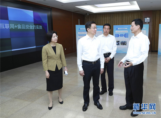 6月13日,在2019年全國(guó)食品安全宣傳周活動(dòng)前夕,中共中央政治局常委、國(guó)務(wù)院副總理、國(guó)務(wù)院食品安全委員會(huì)主任韓正到國(guó)務(wù)院食品安全委員會(huì)辦公室主持召開(kāi)座談會(huì),聽(tīng)取對(duì)食品安全工作的意見(jiàn)建議。這是會(huì)前,韓正參觀(guān)食品安全工作情況展示,考察了解食品安全智慧監(jiān)管的創(chuàng)新舉措。新華社記者龐興雷攝