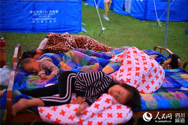 6月19日,宜賓長寧地震后的第二個清晨,安置點(diǎn)內(nèi)還在熟睡的小朋友。(人民網(wǎng) 朱虹 攝)