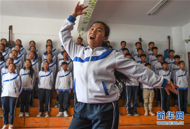 鹽井中學(xué)的學(xué)生們在上音樂課(6月5日攝)。年輕的藏族女教師坐在鋼琴前,手指靈動(dòng)地彈奏樂曲,兩名學(xué)生拉起弦子伴奏,三十多名學(xué)生站成四排,齊聲合唱。學(xué)?;@球場上數(shù)名身材高大的學(xué)生,正在體育老師的組織下進(jìn)行激烈的分組對抗,不一會(huì)兒,學(xué)生們個(gè)個(gè)汗流浹背。綜合樓三樓的化學(xué)實(shí)驗(yàn)室內(nèi),身穿白色大褂的學(xué)生,分成若干小組,正在做簡單的化學(xué)實(shí)驗(yàn)。這一幕幕,同時(shí)出現(xiàn)在西藏昌都市芒康縣鹽井中學(xué)。新華社記者晉美多吉攝