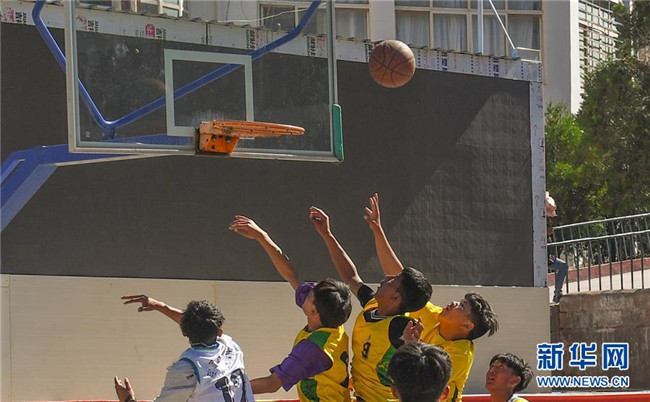 鹽井中學(xué)的學(xué)生們在體育課上打籃球(6月6日攝)。年輕的藏族女教師坐在鋼琴前,手指靈動(dòng)地彈奏樂曲,兩名學(xué)生拉起弦子伴奏,三十多名學(xué)生站成四排,齊聲合唱。學(xué)?;@球場上數(shù)名身材高大的學(xué)生,正在體育老師的組織下進(jìn)行激烈的分組對抗,不一會(huì)兒,學(xué)生們個(gè)個(gè)汗流浹背。綜合樓三樓的化學(xué)實(shí)驗(yàn)室內(nèi),身穿白色大褂的學(xué)生,分成若干小組,正在做簡單的化學(xué)實(shí)驗(yàn)。這一幕幕,同時(shí)出現(xiàn)在西藏昌都市芒康縣鹽井中學(xué)。新華社記者晉美多吉攝