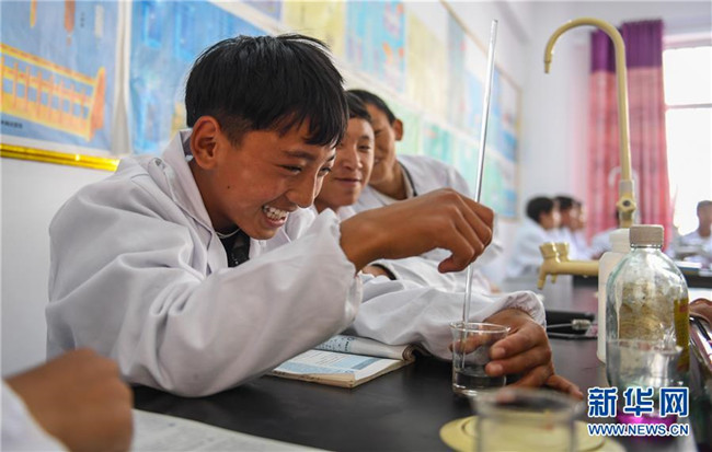 鹽井中學(xué)的學(xué)生們在上化學(xué)課(6月6日攝)。年輕的藏族女教師坐在鋼琴前,手指靈動(dòng)地彈奏樂曲,兩名學(xué)生拉起弦子伴奏,三十多名學(xué)生站成四排,齊聲合唱。學(xué)?;@球場上數(shù)名身材高大的學(xué)生,正在體育老師的組織下進(jìn)行激烈的分組對抗,不一會(huì)兒,學(xué)生們個(gè)個(gè)汗流浹背。綜合樓三樓的化學(xué)實(shí)驗(yàn)室內(nèi),身穿白色大褂的學(xué)生,分成若干小組,正在做簡單的化學(xué)實(shí)驗(yàn)。這一幕幕,同時(shí)出現(xiàn)在西藏昌都市芒康縣鹽井中學(xué)。新華社記者晉美多吉攝