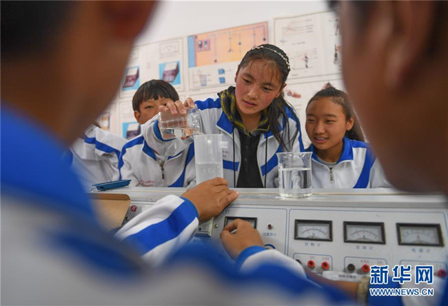 鹽井中學(xué)的學(xué)生們在上物理課(6月6日攝)。年輕的藏族女教師坐在鋼琴前,手指靈動(dòng)地彈奏樂曲,兩名學(xué)生拉起弦子伴奏,三十多名學(xué)生站成四排,齊聲合唱。學(xué)?;@球場上數(shù)名身材高大的學(xué)生,正在體育老師的組織下進(jìn)行激烈的分組對抗,不一會(huì)兒,學(xué)生們個(gè)個(gè)汗流浹背。綜合樓三樓的化學(xué)實(shí)驗(yàn)室內(nèi),身穿白色大褂的學(xué)生,分成若干小組,正在做簡單的化學(xué)實(shí)驗(yàn)。這一幕幕,同時(shí)出現(xiàn)在西藏昌都市芒康縣鹽井中學(xué)。新華社記者晉美多吉攝