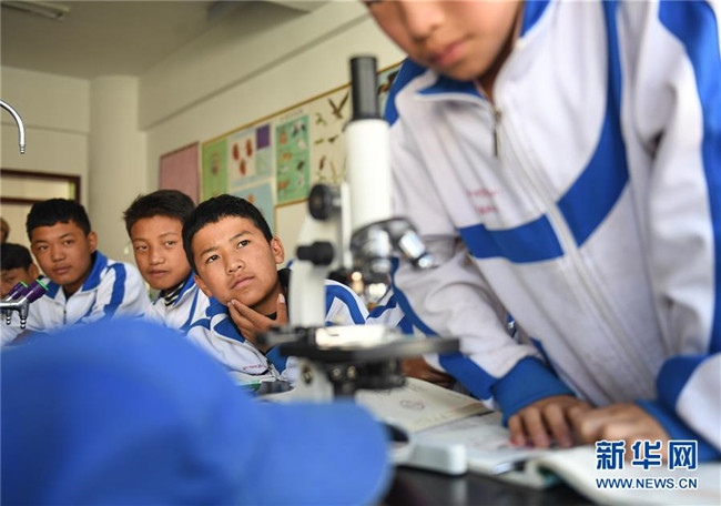 鹽井中學(xué)的學(xué)生們在上生物課(6月6日攝)。年輕的藏族女教師坐在鋼琴前,手指靈動(dòng)地彈奏樂曲,兩名學(xué)生拉起弦子伴奏,三十多名學(xué)生站成四排,齊聲合唱。學(xué)?;@球場上數(shù)名身材高大的學(xué)生,正在體育老師的組織下進(jìn)行激烈的分組對抗,不一會(huì)兒,學(xué)生們個(gè)個(gè)汗流浹背。綜合樓三樓的化學(xué)實(shí)驗(yàn)室內(nèi),身穿白色大褂的學(xué)生,分成若干小組,正在做簡單的化學(xué)實(shí)驗(yàn)。這一幕幕,同時(shí)出現(xiàn)在西藏昌都市芒康縣鹽井中學(xué)。新華社記者晉美多吉攝