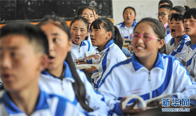 鹽井中學(xué)的學(xué)生們在上英語課(6月6日攝)。年輕的藏族女教師坐在鋼琴前,手指靈動(dòng)地彈奏樂曲,兩名學(xué)生拉起弦子伴奏,三十多名學(xué)生站成四排,齊聲合唱。學(xué)校籃球場上數(shù)名身材高大的學(xué)生,正在體育老師的組織下進(jìn)行激烈的分組對抗,不一會(huì)兒,學(xué)生們個(gè)個(gè)汗流浹背。綜合樓三樓的化學(xué)實(shí)驗(yàn)室內(nèi),身穿白色大褂的學(xué)生,分成若干小組,正在做簡單的化學(xué)實(shí)驗(yàn)。這一幕幕,同時(shí)出現(xiàn)在西藏昌都市芒康縣鹽井中學(xué)。新華社記者晉美多吉攝