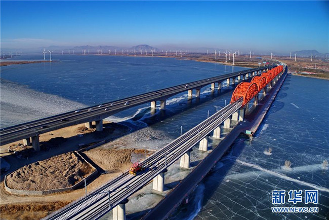 中鐵三局工人在河北張家口京張高鐵官廳水庫特大橋進(jìn)行鋪軌作業(yè)(1月13日無人機(jī)拍攝)。新華社記者 楊世堯 攝