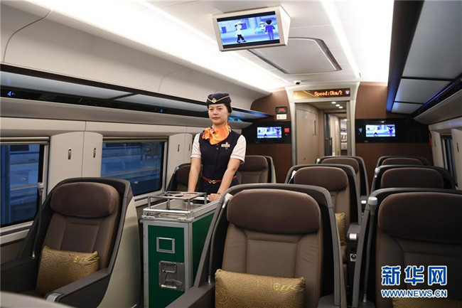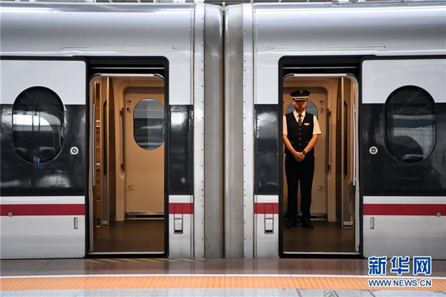 7月11日,乘務(wù)員在G319次列車上做發(fā)車前的準(zhǔn)備工作。當(dāng)日,重慶至香港直達(dá)高鐵正式開通,此次首發(fā)的G319次復(fù)興號列車運行速度350km/h,沿途經(jīng)停遵義、貴陽東、桂林西、肇慶東、廣州南和深圳北站。列車由重慶西站至香港西九龍站全程運行需7小時37分鐘,全程票二等座票價為660元。目前內(nèi)地與香港聯(lián)通的高鐵車站已增加到58個。新華社記者唐奕攝