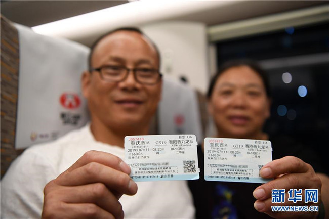 7月11日,乘坐G319次列車的乘客展示前往香港的車票。當(dāng)日,重慶至香港直達(dá)高鐵正式開通,此次首發(fā)的G319次復(fù)興號列車運行速度350km/h,沿途經(jīng)停遵義、貴陽東、桂林西、肇慶東、廣州南和深圳北站。列車由重慶西站至香港西九龍站全程運行需7小時37分鐘,全程票二等座票價為660元。目前內(nèi)地與香港聯(lián)通的高鐵車站已增加到58個。新華社記者唐奕攝