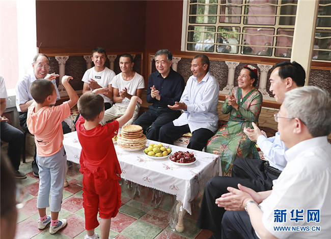 7月14日至16日,第七次全國(guó)對(duì)口支援新疆工作會(huì)議在新疆和田召開(kāi)。中共中央政治局常委、中央新疆工作協(xié)調(diào)小組組長(zhǎng)汪洋出席會(huì)議并講話。在和田期間,汪洋還參觀了對(duì)口援疆工作成就展,考察了有關(guān)單位和企業(yè),看望了脫貧戶。這是7月15日,汪洋在新疆和田英阿瓦提鄉(xiāng)吐如孜村考察。 新華社記者 丁林 攝