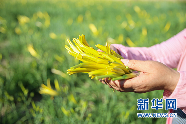 一位村民向記者展示剛剛采摘下來(lái)的黃花菜(7月4日拍攝)。 新華網(wǎng) 肖寒 攝