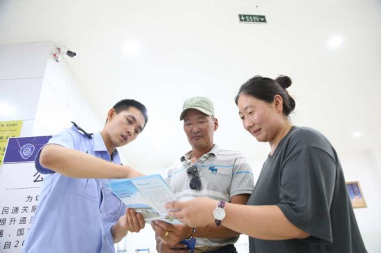 在滿(mǎn)都拉口岸,包頭出入境邊防檢查站執(zhí)勤業(yè)務(wù)科副科長(zhǎng)宋強(qiáng)每天24小時(shí)帶著對(duì)講機(jī)。執(zhí)勤時(shí),他的代號(hào)是“04”。