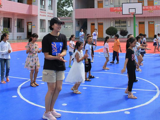 清華大學“19黔行”支教隊員和小朋友們一起做課間操。鄔雄亮/攝