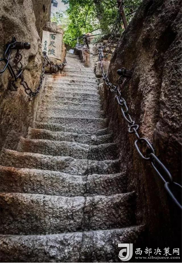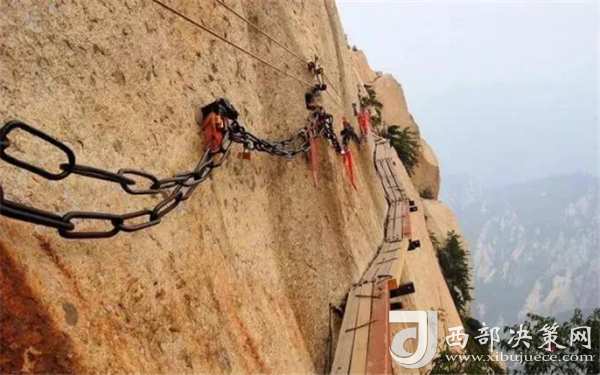 在萬仞絕壁上鑲嵌石釘搭木椽而筑,棧道上下皆是懸崖絕壁,鐵索橫懸,游人至此,面壁貼腹,屏氣挪步,被譽(yù)為“華山第一天險(xiǎn)”。