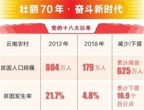 隨著精準(zhǔn)扶貧的深入推進(jìn),全省農(nóng)村貧困人口大幅減少,貧困發(fā)生率持續(xù)下降。國家統(tǒng)計(jì)局云南調(diào)查總隊(duì)發(fā)布的數(shù)據(jù)顯示:黨的十八大以來,云南農(nóng)村貧困人口規(guī)模從2012年804萬人減少到2018年179萬人,累計(jì)減貧625萬人,年均減貧104萬人;農(nóng)村貧困發(fā)生率從2012年的21.7%,持續(xù)下降到2018年的4.8%,累計(jì)下降16.9個(gè)百分點(diǎn),年均下降2.8個(gè)百分點(diǎn)。2018年全省貧困地區(qū)農(nóng)村居民人均可支配收入9595元,是2012年的2倍,年均增長12.4%。貧困地區(qū)農(nóng)村居民收入增速持續(xù)高于全省農(nóng)村平均增速。