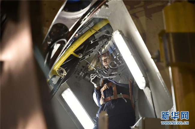 工人在沈陽北方重工集團一部在造的掘進機內(nèi)部作業(yè)(2016年12月7日攝)。新華社記者 姚劍鋒 攝