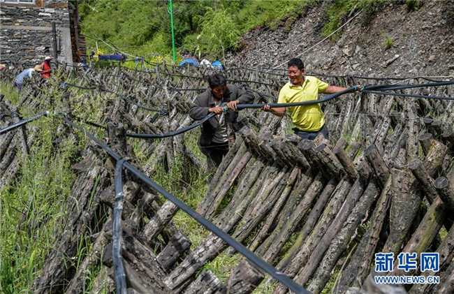 8月10日,東方電氣集團東方汽輪機有限公司駐村扶貧干部侯吉才(右)和村民一起為青杠木耳基地更換噴淋水管。新華社記者 張超群 攝